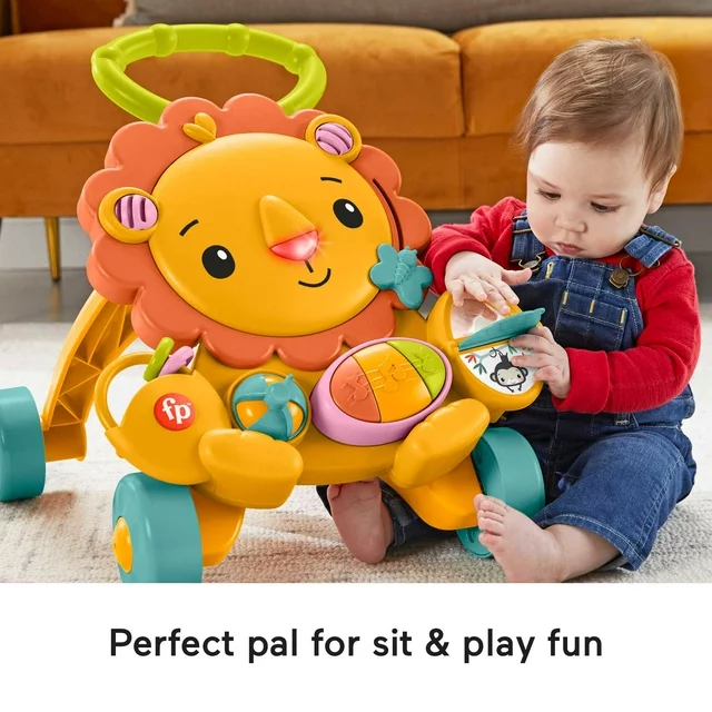 The Musical Lion Walker from Fisher-Price has 8 different activities to keep your little one busy while they sit & playfrom spinning, flipping, pressing, clacking, sliding, to playing peek-a-boo in the mirror! And when your baby’s ready to pull up, stand and walk, this sturdy lion friend bravely helps steady baby’s first steps. Plus, lights, sounds and music play as baby pushes their lion pal along, encouraging little walkers to keep going.