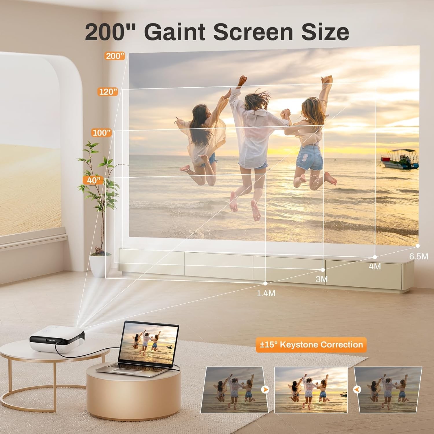 • ?【200” Giant Screen &±15°Keystone Correction] Mini Portable projector provides 40-200 inches projection display, at 6.8-16.4 feet projection distance. Keystone correction make setting up and getting the perfect screen position a breeze. It is a good choice as a indoor bedroom home theater, and also good for outdoor movie night for families.