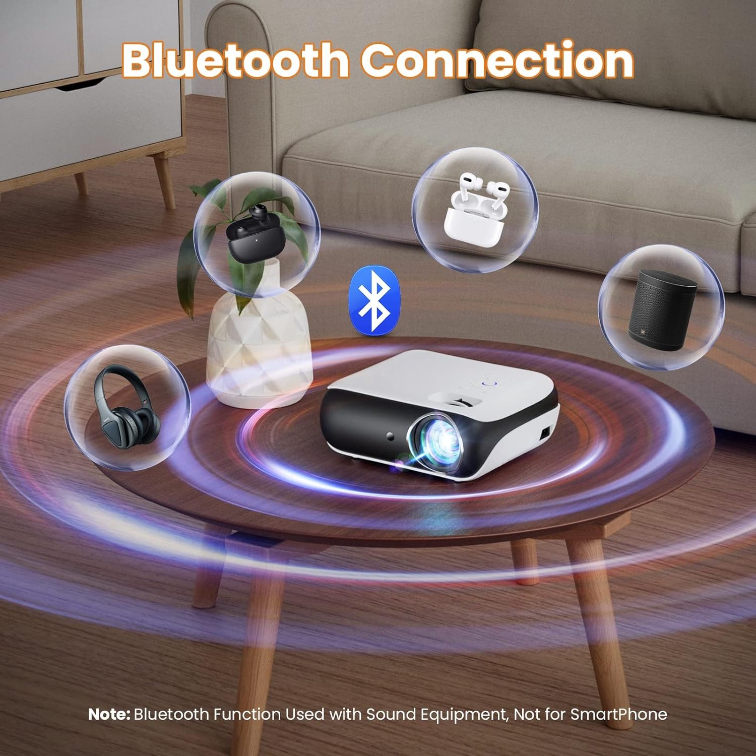 • ?【Bluetooth 5.1 Function & HiFi Stereo Speaker] The movie projector has built-in powerful dual speakers, that offers you crisp clear sound and excellent auditory sense experience. The bluetooth projector support wireless connecting bluetooth speakers, soundbar, headphones and other audio equipment through bluetooth 5.1 chip. So you can experience the cinema-level surround effect at home.(Bluetooth does not support connecting smartphones and Alexa, only audio devices).