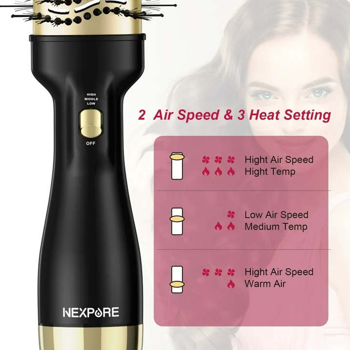 The Nexpure one-step hair dryer and volumizer is a designed hot air brush to deliver gorgeous volume and brilliant shine in a single step. The unique non detachable oval brush design smooths hair while the rounded edges quickly create volume at the root for beautifully full-bodied bends at the ends in a single pass. The brush is designed with nylon pin and tufted bristles for detangling, improve volume and control. Styling flexibility with 3 heat/speed settings and a cool option. Built to provide just the right amount of heat. Unlike conventional hair dryers, this volumizer can be placed closer to the scalp for lift. Boosted by ionic technology through a built-in genuine ION generator, hair dries fast and helps reduce heat damage.