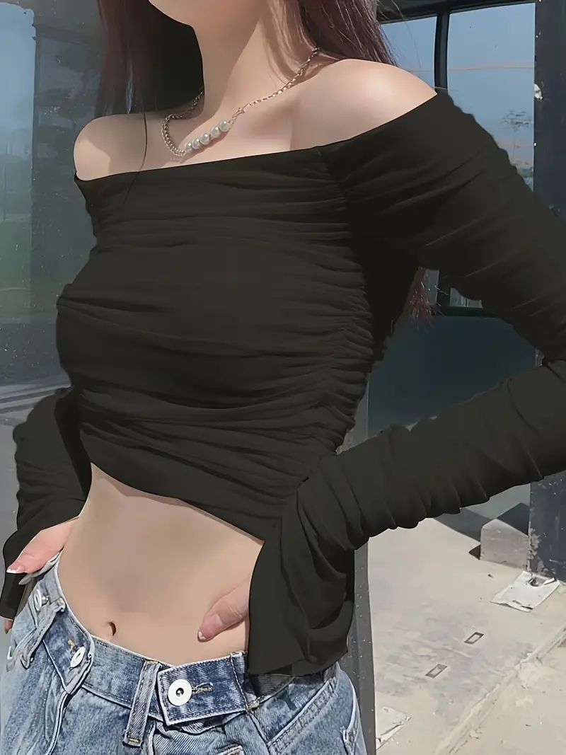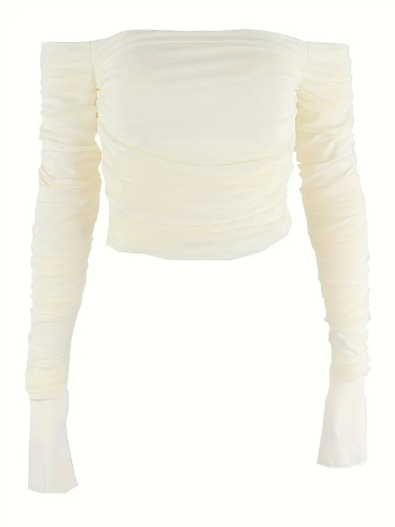 Solid Color Off-shoulder Ruched Top, Elegant Extra-long Sleeve Top For Spring & Fall, Women's Clothing