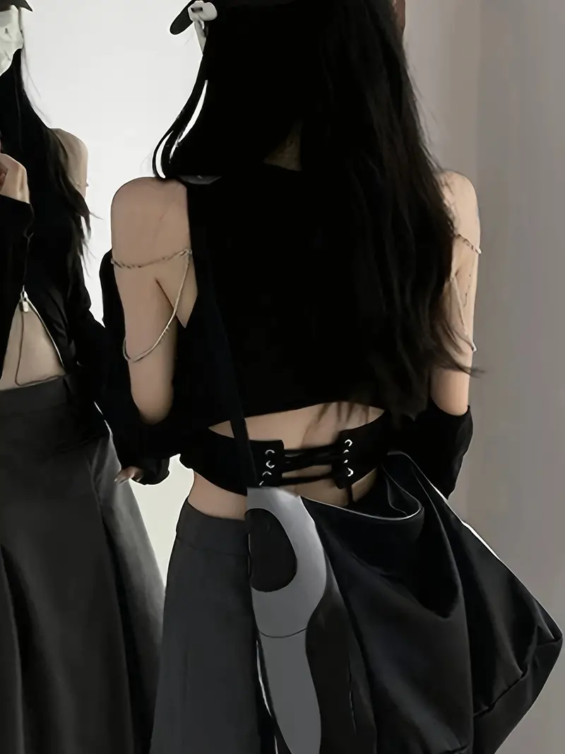 Solid Zipper Chain Decor Crop Top, Versatile Cut Out Long Sleeve Top For Spring & Fall, Women's Clothinghjhj