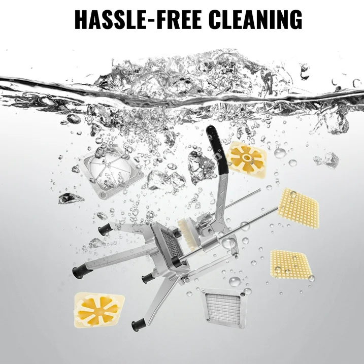 The commercial vegetable chopper is made of heavy-duty stainless steel and aluminum alloy materials, equipped with four blades: 1/2, 3/8, 1/4 inch, and a 6-wedge slicer. The ergonomic handle is labor-saving, and non-slip feet ensure stable operation. The blades and push blocks are both removable and washable. This commercial vegetable fruit chopper is very suitable for restaurants and home kitchens.